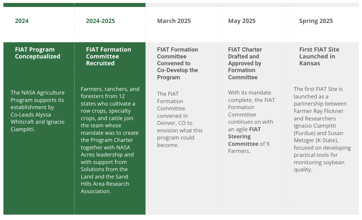 NASA Acres Farm Innovation Ambassador Team (FIAT) aims to unite farmer members and NASA Acres researchers in the development and use of satellite Earth observation (EO) data, products and models to support producers in their decision-making processes. This aligns with NASA Acres' mission to create impactful, science-based tools for the benefit of US agriculture.