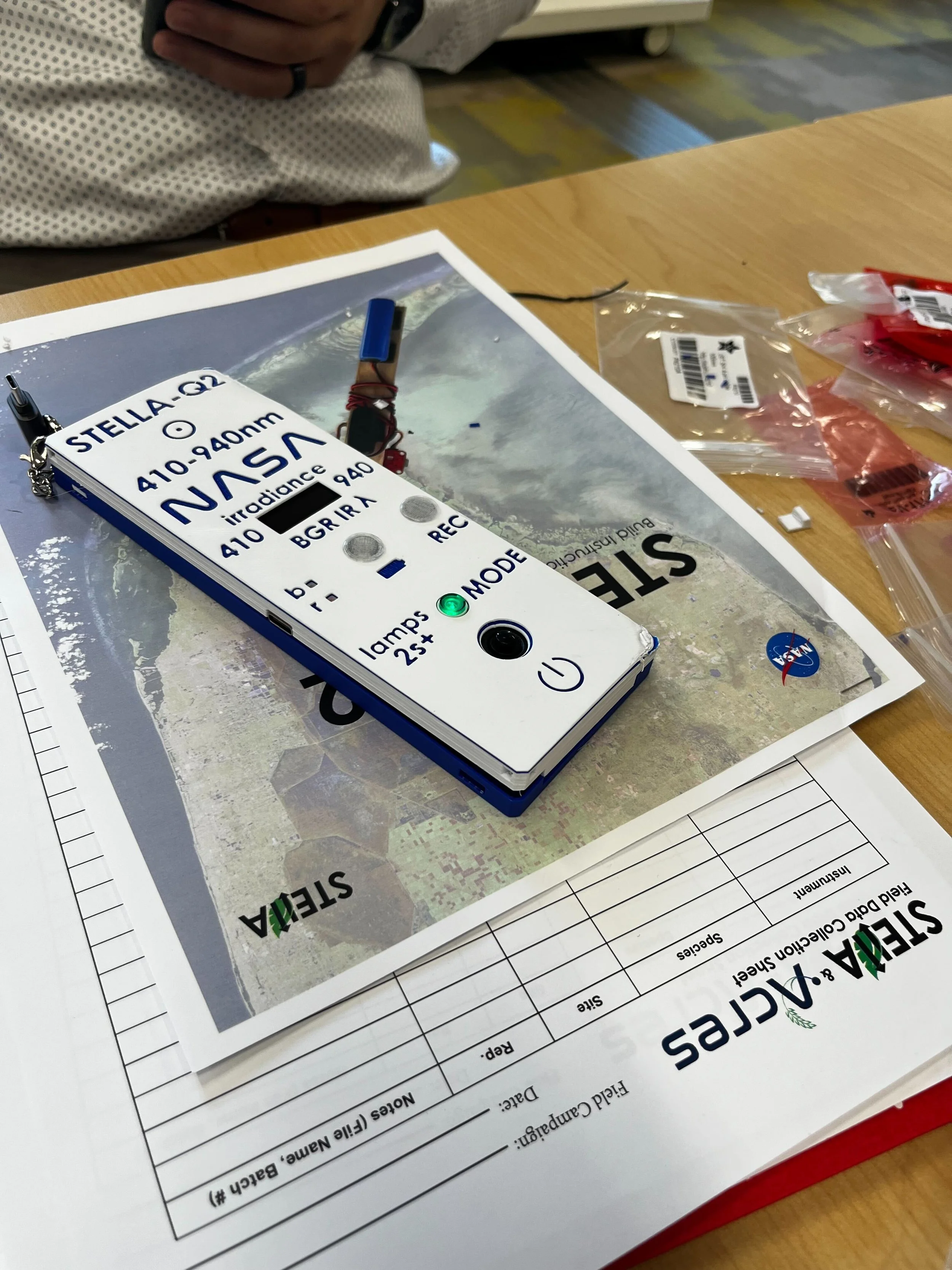 During the workshop, teachers progressed from understanding how sunlight interacts with Earth’s surfaces to applying Landsat imagery, measuring spectral reflectance with STELLA-Q2 spectrometers, and analyzing vegetation health using NDVI, gaining skills they will now bring directly to their classrooms and students. The presenters highlighted techniques that support agricultural applications, demonstrating how NASA satellite data and field spectroscopy inform crop monitoring, resource management, and decision-making. Teachers assembled and programmed their own instruments, collected and analyzed field data, and gained practical experience aligned with real NASA mission applications. Participants left the event with functioning instruments, hands-on remote sensing experience, and positive feedback highlighting the value of the workshop’s practical, real-world focus.