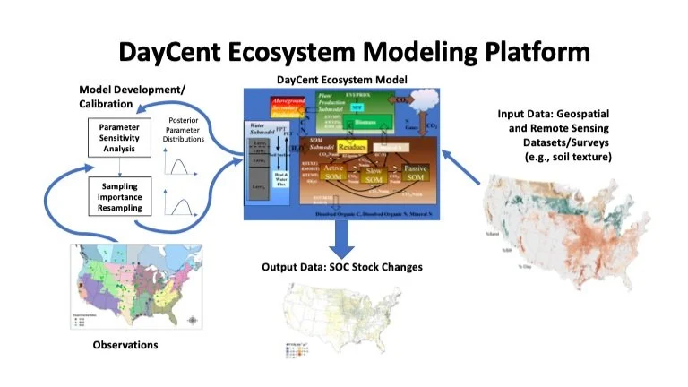 The DayCent ecosystem model is used by the U.S. National Government for reporting greenhouse gas (GHG) emissions from agricultural lands to the U.N. Framework Convention on Climate Change. This project will enhance reporting by extending the time series of Enhanced Vegetation Index (EVI) Data for simulating crop and grassland forage production in the model. Accurate representation of this process is critical for estimating C inputs to soil C pools, and estimating the impact of N uptake by crops and forages on nitrification and denitrification. We will test several satellite-based products for extending the time series beyond the coverage from MODIS, and then calibrate the light-use efficiency algorithm in DayCent using Bayesian methods with the new dataset. Independent data will be used to assess the accuracy of production estimates from the calibrated model. The new EVI data product will be used to drive DayCent simulations and estimate soil C stock changes and soil nitrous oxide emissions for croplands with major commodity crops as well as grasslands in the conterminous United States.
